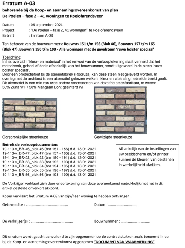 Bij een eerste contact blijkt dat de originele steen niet meer leverbaar is, en er daarom is gekozen voor de afgebeelde variant. Dit zonder ons (de kopers) te informeren en daarbij dus ook geen akkoord vanuit ons. Dit voelt een beetje als een rode auto bestellen, maar een blauwe geleverd krijgen... dit verandert naar onze mening de aantrekkelijkheid van ons nieuwe huis en ook de gehele buurt behoorlijk.