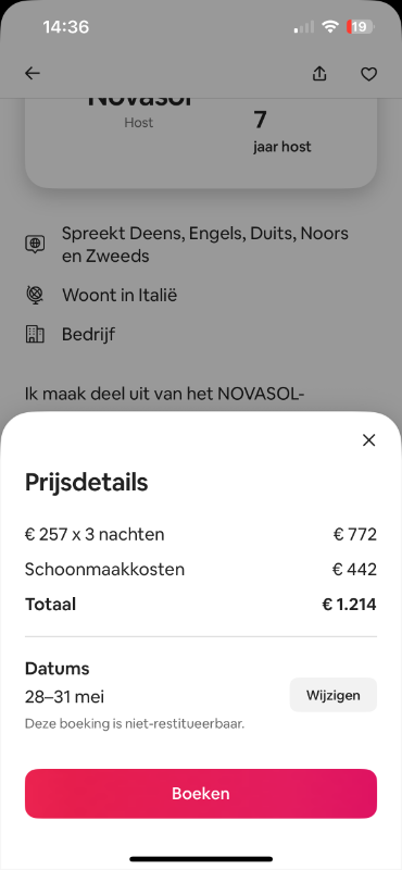 Per ongeluk met mijn vinger langs de ‘boeken’ knop geswiped toen ik de app wilde afsluiten. Zie bijgevoegde foto. Direct door naar Pay Pal en via geautomatiseerde autorisatie via Face ID werd de betaling direct geactiveerd. We waren compleet in shock. Hoe kan zoiets gebeuren? Boeking direct geannuleerd. Nu al 5 dagen verder en worden van het kastje naar de muur gestuurd. Ja personeel die we spreken is vriendelijk maar zeggen na 5 dagen NIKS te kunnen doen. Wij moeten nu € 1400,- betalen en we hebben helemaal niks. Helaas zit er een bedrijf achter, Novasol. Die geen coulance willen geven en nergens in tegemoet willen komen. Dit zijn onze annuleringsvoorwaarden en jullie voldoen daar dit aan. We moeten 100 % betalen en hebben niks. Ongelooflijk dat dit kan in deze tijd. We zijn er echt kapot van.